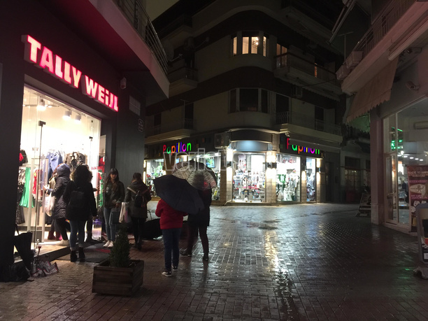 Η κίνηση όπως ήταν αναμενόμενο ήταν υποτονική, ειδικά όσο περνούσε η ώρα και η βροχή δυνάμωνε και το κρύο αναλογικά με την εποχή τσουχτερό. Ώρα 10 το βράδυ και ελάχιστοι ήταν οι καταναλωτές που μπαινόβγαιναν στα καταστήματα. Πολλοί από αυτούς, αφού έκαναν τη βόλτα τους, κατέφυγαν στα καφέ του κέντρου για να στεγνώσουν και να ζεσταθούν.