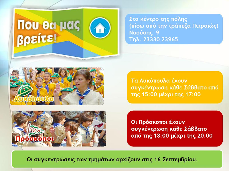 Η νέα προσκοπική χρονιά ξεκινά ο προσκοπισμός είναι έτοιμος πάλι να δώσει σε όλα τα παιδιά & τους νέους την ευκαιρία να ζήσουν την ευχαρίστηση της προσφοράς στην κοινωνία μας, να ανακαλύψουν και να μάθουν κάτι νέο μέσα από παιχνίδια περιπέτειας, να βιώσουν την ζωή στην φύση, να συμμετέχουν σε πολιτιστικές δραστηριότητες.