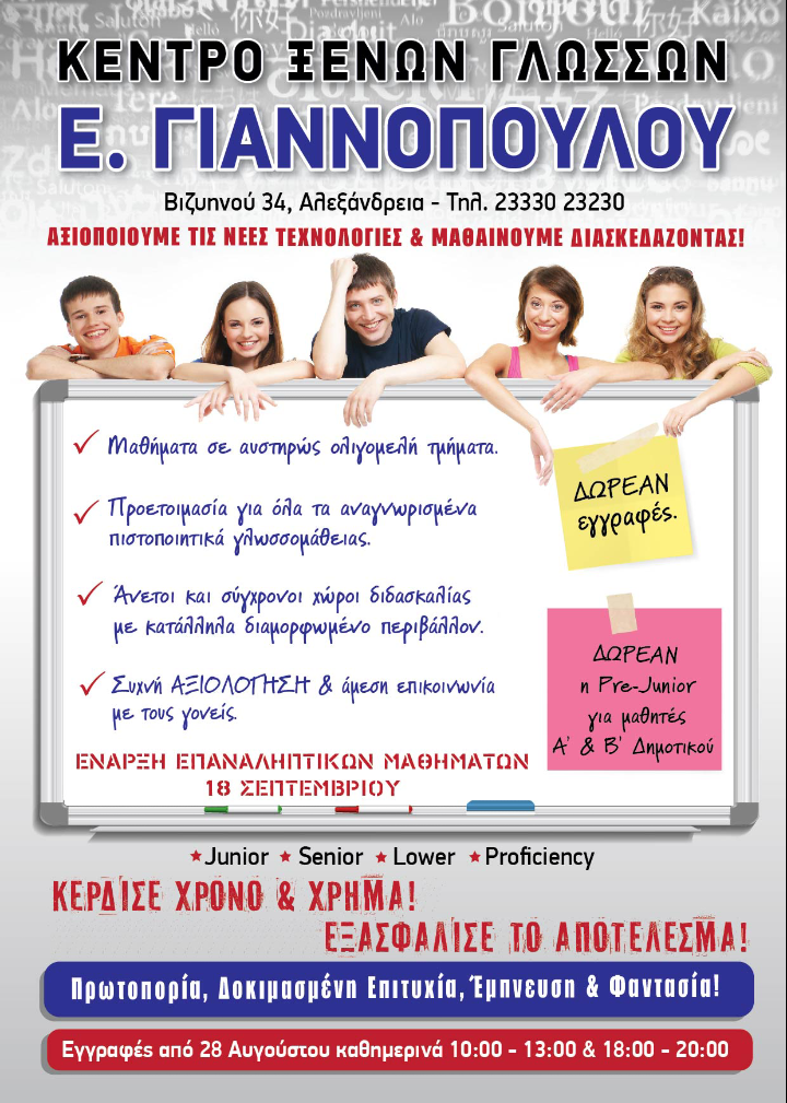 Το Κέντρο Ξένων Γλωσσών “ΕΛΣΑ ΓΙΑΝΝΟΠΟΥΛΟΥ” συγχαίρει τους μαθητές του για την μεγάλη τους επιτυχία στις εξετάσεις γλωσσομάθειας κατά τη σχολική περίοδο 2016-2017.