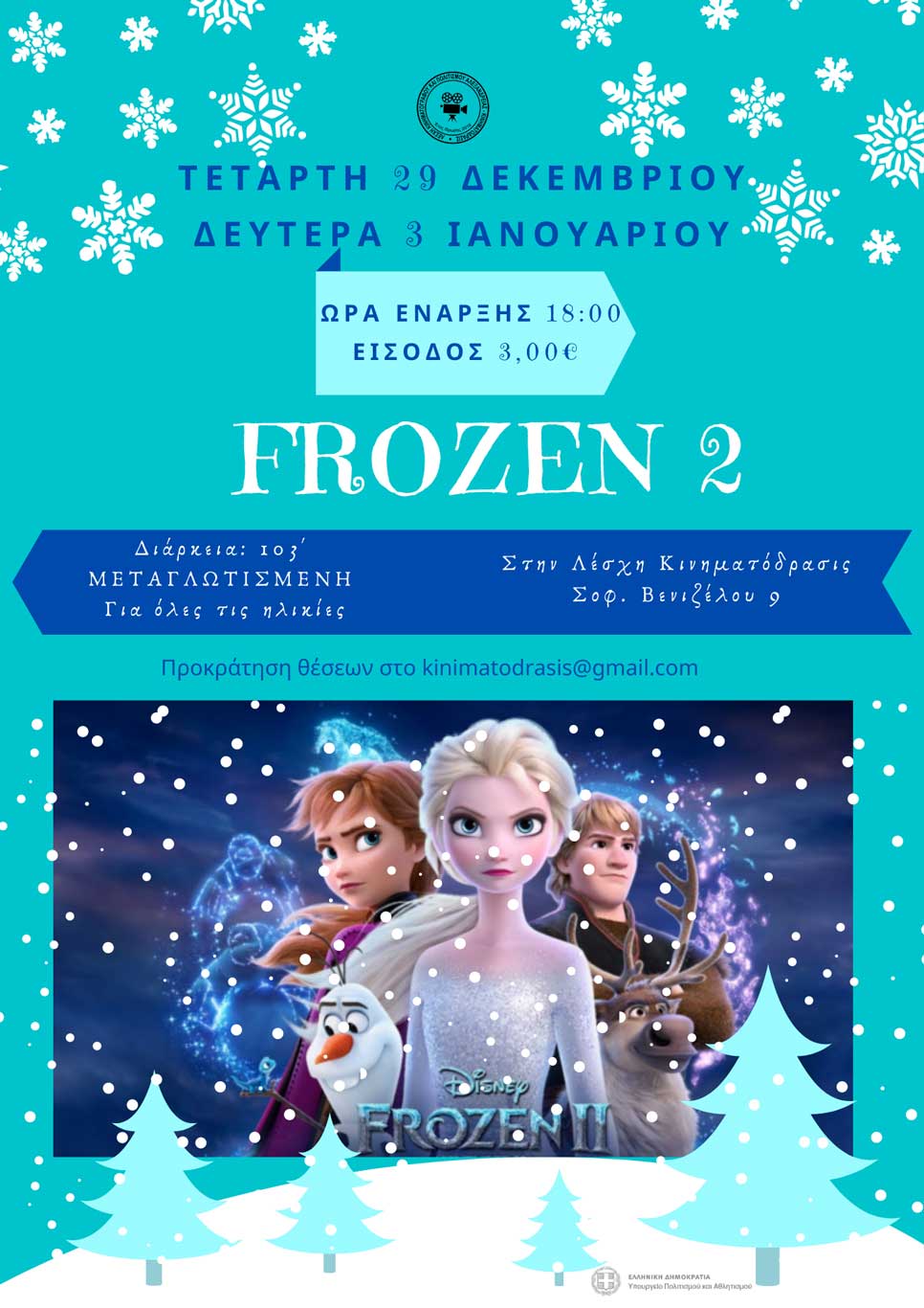 Της παιδικής ταινίας Frozen 2, Τετάρτη 29/12 και Δευτέρα 3/12 στις 6 μ.μ. στο χώρο της λέσχης (Σοφ. Βενιζέλου 9).