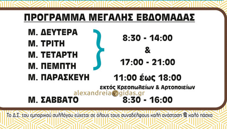 Ξεκίνησε από σήμερα Μ. Δευτέρα 2 Απριλίου το εορταστικό ωράριο λειτουργίας για τα καταστήματα της Αλεξάνδρειας.