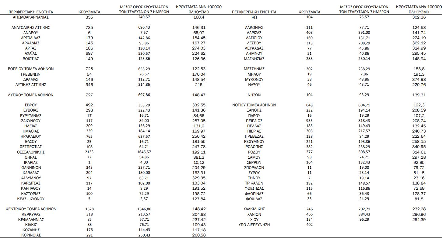 Με βάση τα επιβεβαιωμένα κρούσματα των τελευταίων 7 ημερών, 431 θεωρούνται σχετιζόμενα με ταξίδι από το εξωτερικό και 1.856 είναι σχετιζόμενα με ήδη γνωστό κρούσμα.