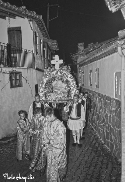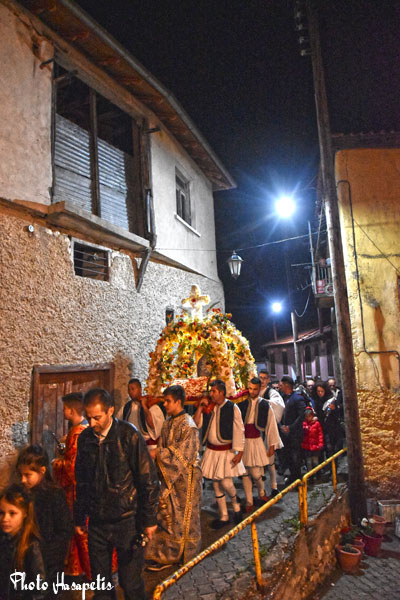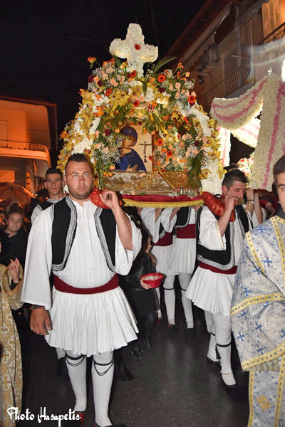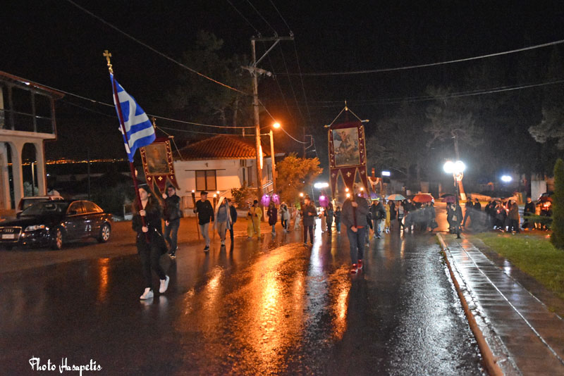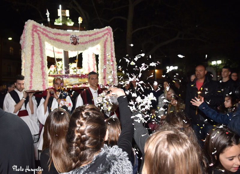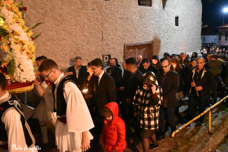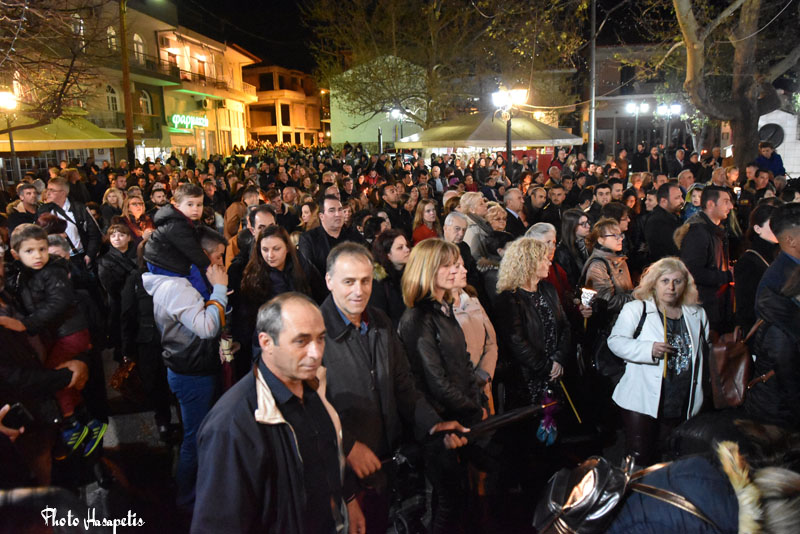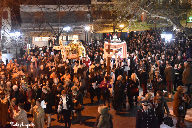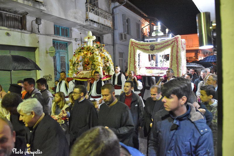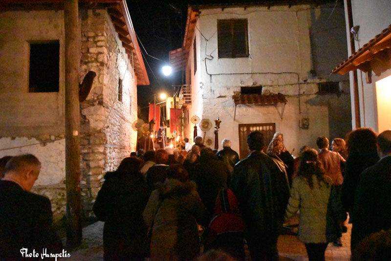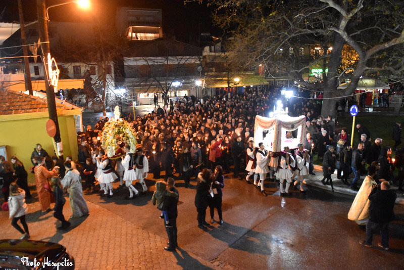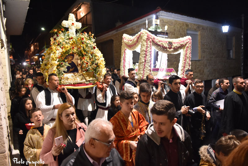 Οι δύο, περίτεχνα στολισμένοι, Επιτάφιοι αφού συναντήθηκαν στην διασταύρωση «Σαμαρά» πορεύτηκαν υπό τους πένθιμους ήχους της φιλαρμονικής μέχρι την κεντρική πλατεία και στην συνέχεια χώρισαν ακολουθώντας ο καθένας ξεχωριστή πορεία για τους δύο ενοριακούς ναούς.
