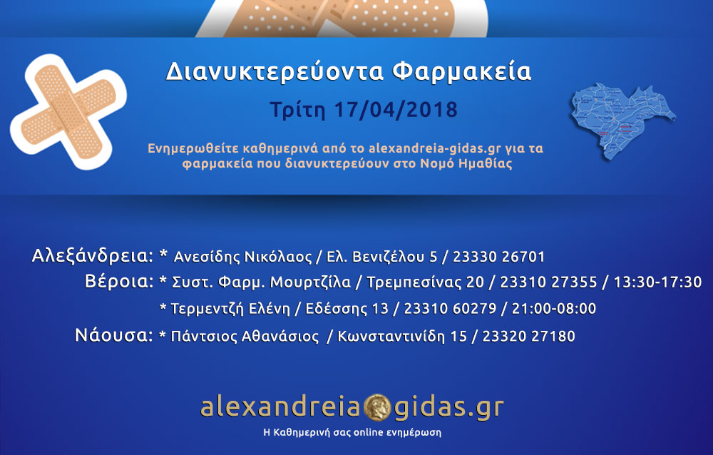 ΤΟΠΙΚΑ 17 Απριλίου, 2018 posted by admin Share Εφημερεύοντα – διανυκτερεύοντα φαρμακεία Ημαθίας Τρίτη 17 Απριλίου Αλεξάνδρεια: Αφήστε μια απάντηση Ακύρωση απάντησηςΗ ηλ. διεύθυνση σας δεν δημοσιεύεται. Τα υποχρεωτικά πεδία σημειώνονται με *Σχόλιο * Όνομα Email Ιστότοπος Αποθήκευσε το όνομά μου, email, και τον ιστότοπο μου σε αυτόν τον πλοηγό για την επόμενη φορά που θα σχολιάσω.