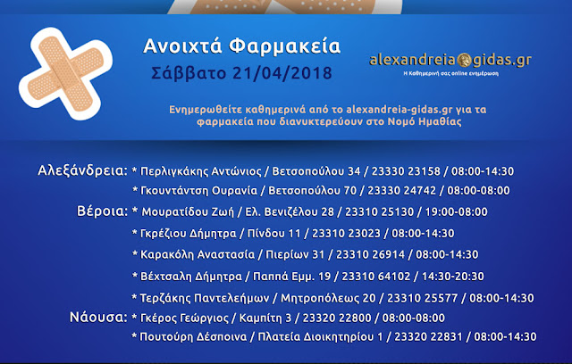Ανοιχτά φαρμακεία Ημαθίας Σάββατο 21 Απριλίου