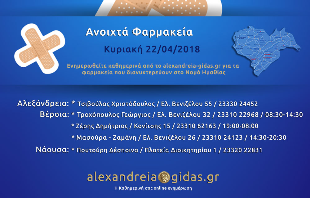 Ανοιχτά φαρμακεία Ημαθίας Κυριακή 22 Απριλίου