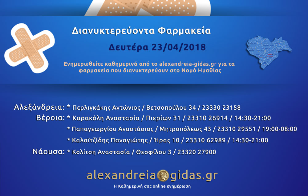 Διανυκτερεύοντα φαρμακεία Ημαθίας Δευτέρα 23 Απριλίου