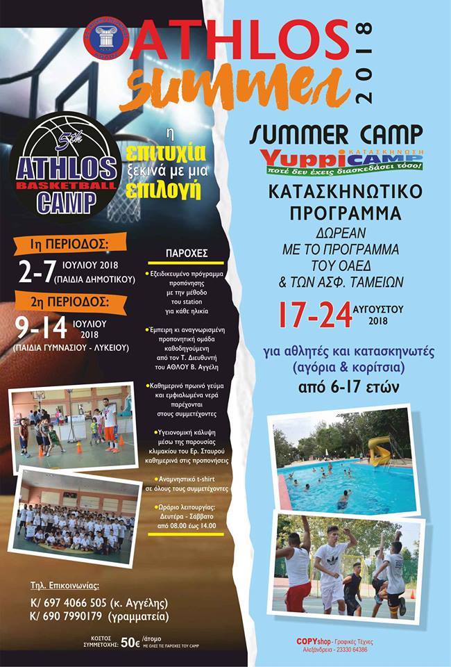 Το 5o ATHLOS BASKETBALL CAMP που διεξάγεται στις εγκαταστάσεις του κλειστού γυμναστηρίου του 2ου Γυμνασίου Αλεξάνδρειας είναι γεγονός και θα πραγματοποιηθεί για πρώτη φορά σε δύο περιόδους ,λόγω της τεράστιας απήχησης που είχαν οι προηγούμενες διοργανώσεις.