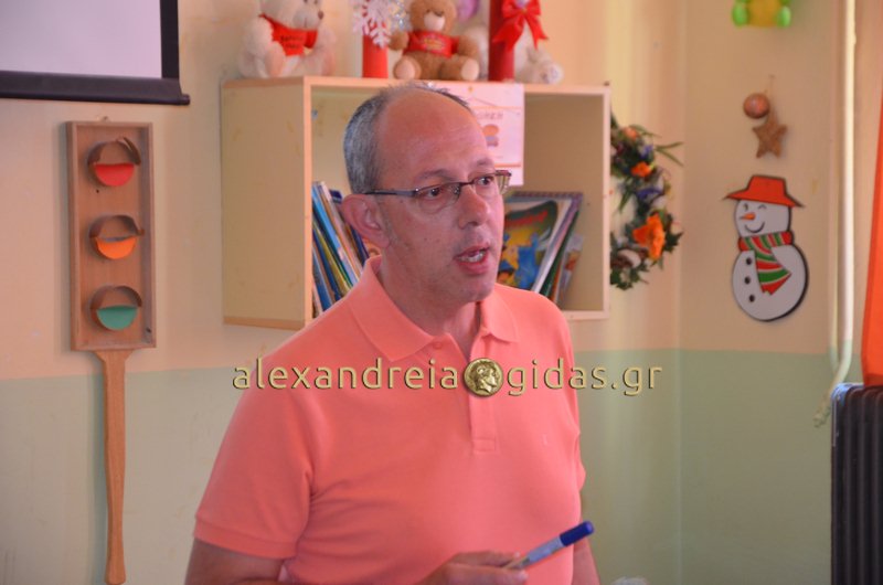 Τον κ. Πραβινό προλόγισε και σύστησε στους μαθητές η Διευθύντρια του 1ου Δημοτικού Σχολείου Αλεξάνδρειας Κική Μουσαφίρη.