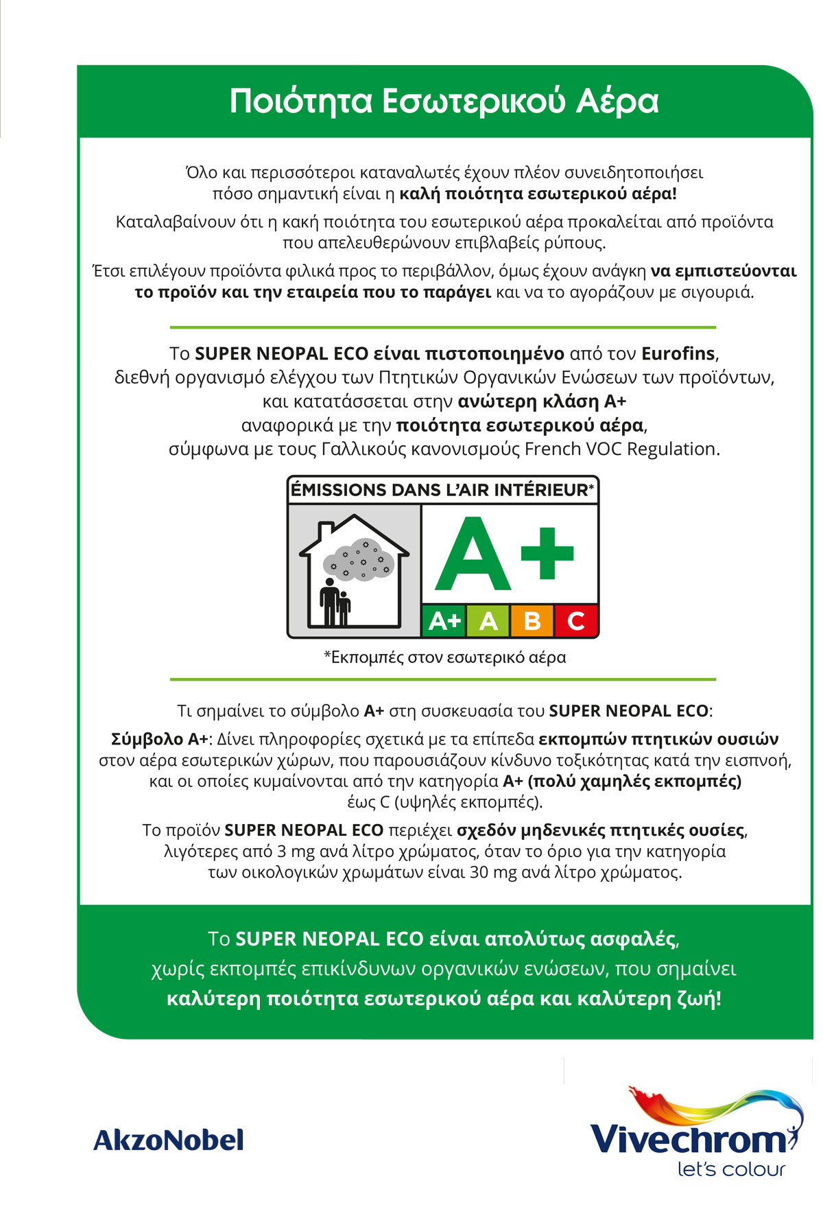 Στις ΧΡΩΜΟΣΥΝΘΕΣΕΙΣ ΣΤΑΜΠΟΥΛΗΣ θα βρείτε το SUPER NEOPAL ECO οικολογικό ματ πλαστικό χρώμα ασυναγώνιστης ποιότητας. Είναι πιστοποιημένο από το AFNOR και πληροί τα κριτήρια του οικολογικού σήματος Ecolabel της Ε.Ε. Δεν περιέχει αμμωνία ούτε επικίνδυνες ουσίες όπως βαρέα μέταλλα, ελεύθερη φορμαλδεΰδη, αρωματικούς υδρογονάνθρακες και είναι φιλικό προς το χρήστη και το περιβάλλον.