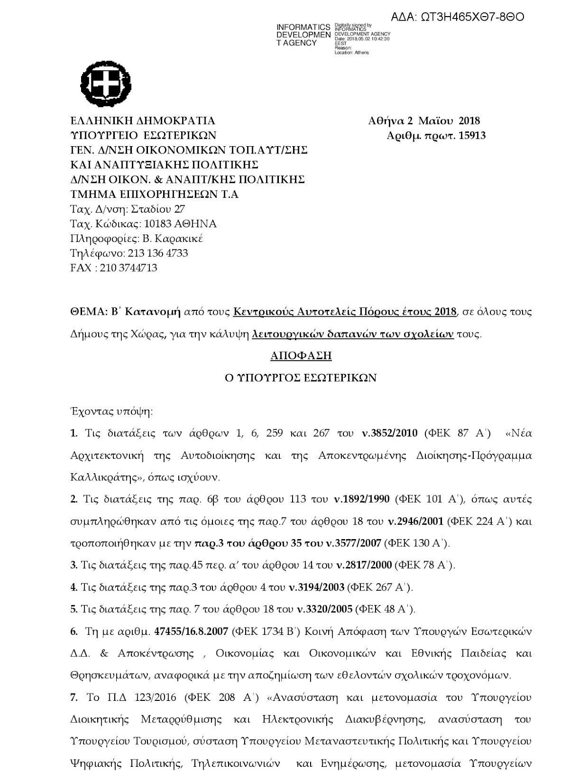 Στους δήμους όλης της χώρας αποδόθηκε Β΄δόση για τις λειτουργικές δαπάνες των σχολείων για το 2018.