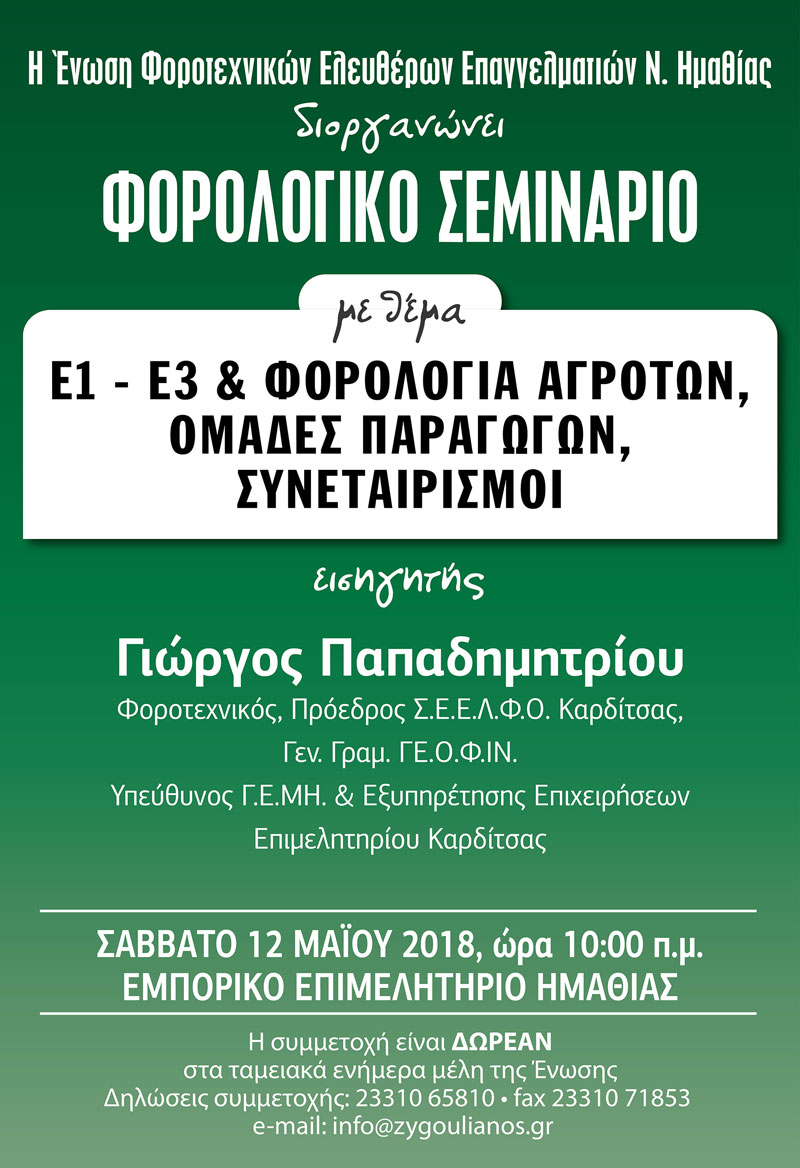 Το Διοικητικό Συμβούλιο της Ε.Φ.Ε.Ε. Νομού Ημαθίας, διοργανώνει φορολογικό Σεμινάριο με θέματα “Ε1 – Ε3 & Φορολογία Αγροτών, Ομάδες Παραγωγών, Συνεταιρισμοί” το Σάββατο 12 Μαΐου 2018 στις 09:30 π.μ. στο Εμπορικό Επιμελητήριο Ημαθίας.