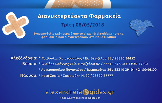 ΤΟΠΙΚΑ 8 Μαΐου, 2018 posted by admin Share Εφημερεύοντα – διανυκτερεύοντα φαρμακεία Ημαθίας Τρίτη 8 Μαΐου Αλεξάνδρεια: Αφήστε μια απάντηση Ακύρωση απάντησηςΗ ηλ. διεύθυνση σας δεν δημοσιεύεται. Τα υποχρεωτικά πεδία σημειώνονται με *Σχόλιο * Όνομα Email Ιστότοπος Αποθήκευσε το όνομά μου, email, και τον ιστότοπο μου σε αυτόν τον πλοηγό για την επόμενη φορά που θα σχολιάσω.