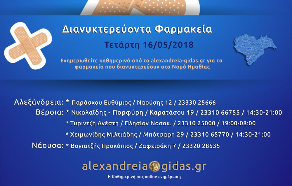 ΤΟΠΙΚΑ 16 Μαΐου, 2018 posted by admin Share Εφημερεύοντα – διανυκτερεύοντα φαρμακεία Ημαθίας Τετάρτη 16 Μαΐου Αλεξάνδρεια: Αφήστε μια απάντηση Ακύρωση απάντησηςΗ ηλ. διεύθυνση σας δεν δημοσιεύεται. Τα υποχρεωτικά πεδία σημειώνονται με *Σχόλιο * Όνομα Email Ιστότοπος Αποθήκευσε το όνομά μου, email, και τον ιστότοπο μου σε αυτόν τον πλοηγό για την επόμενη φορά που θα σχολιάσω.