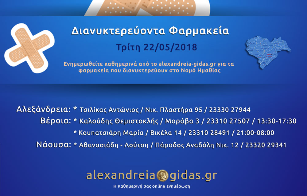 ΤΟΠΙΚΑ 22 Μαΐου, 2018 posted by admin Share Εφημερεύοντα – διανυκτερεύοντα φαρμακεία Ημαθίας Τρίτη 22 Μαΐου Αλεξάνδρεια: Αφήστε μια απάντηση Ακύρωση απάντησηςΗ ηλ. διεύθυνση σας δεν δημοσιεύεται. Τα υποχρεωτικά πεδία σημειώνονται με *Σχόλιο * Όνομα Email Ιστότοπος Αποθήκευσε το όνομά μου, email, και τον ιστότοπο μου σε αυτόν τον πλοηγό για την επόμενη φορά που θα σχολιάσω.