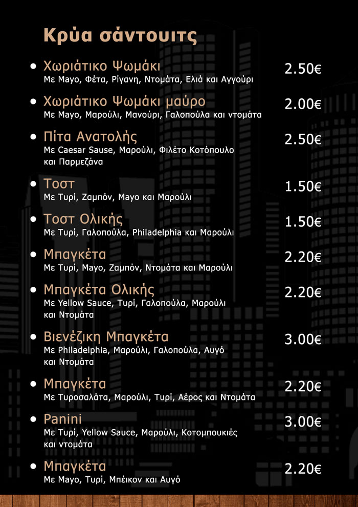 Δοκίμασε μοναδικά κρύα σάντουιτς κάθε στιγμή της ημέρας. Διάλεξε τα υλικά που προτιμάς και φτιάξε το σάντουιτς της αρεσκείας σου.