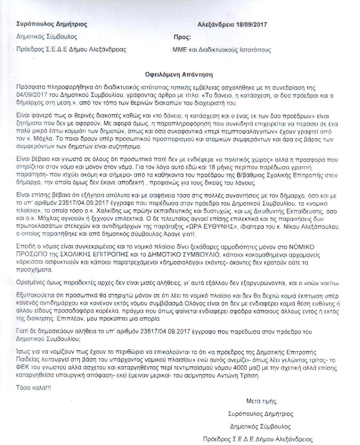 Επιστολή του προέδρου της Σχολικής Επιτροπής Δευτεροβάθμιας Εκπαίδευσης Δημήτρη Συρόπουλου λάβαμε το πρωί της Δευτέρας 18 Σεπτεμβρίου με τίτλο “Οφειλόμενη Απάντηση”.