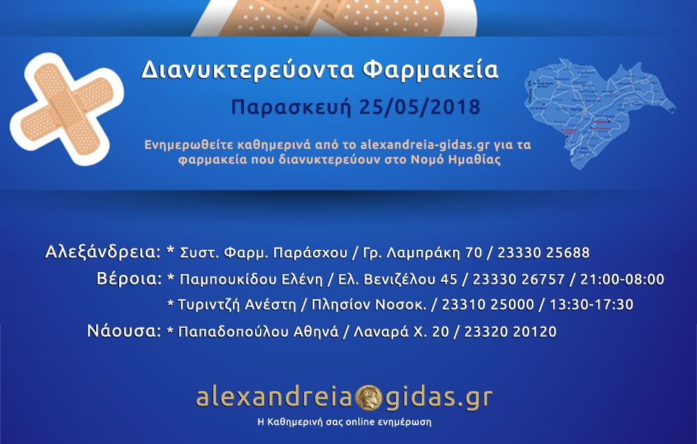 ΤΟΠΙΚΑ 25 Μαΐου, 2018 posted by admin Share Διανυκτερεύοντα φαρμακεία Ημαθίας Παρασκευή 25 Μαΐου Αλεξάνδρεια: Αφήστε μια απάντηση Ακύρωση απάντησηςΗ ηλ. διεύθυνση σας δεν δημοσιεύεται. Τα υποχρεωτικά πεδία σημειώνονται με *Σχόλιο * Όνομα Email Ιστότοπος Αποθήκευσε το όνομά μου, email, και τον ιστότοπο μου σε αυτόν τον πλοηγό για την επόμενη φορά που θα σχολιάσω.