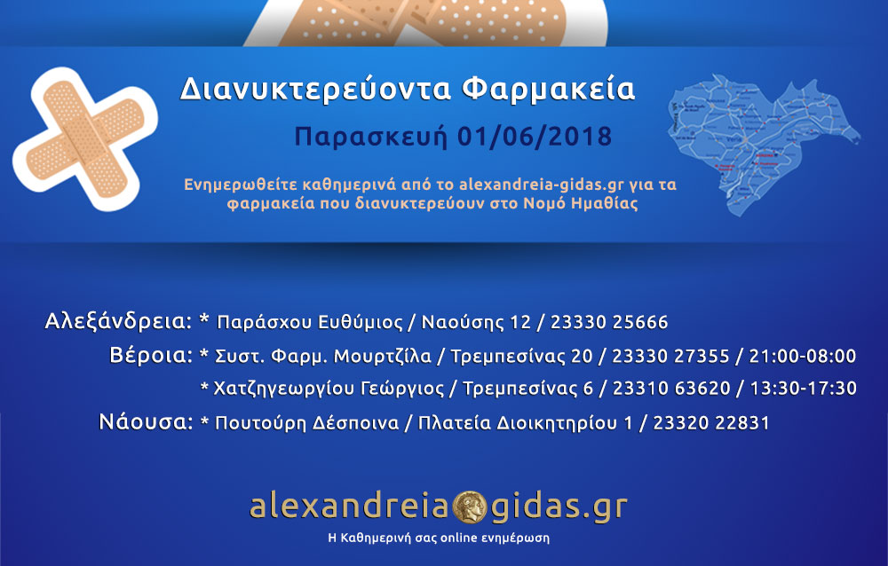 ΤΟΠΙΚΑ 1 Ιουνίου, 2018 posted by admin Share Εφημερεύοντα – διανυκτερεύοντα φαρμακεία Ημαθίας Παρασκευή 1 Ιουνίου Αλεξάνδρεια: Αφήστε μια απάντηση Ακύρωση απάντησηςΗ ηλ. διεύθυνση σας δεν δημοσιεύεται. Τα υποχρεωτικά πεδία σημειώνονται με *Σχόλιο * Όνομα Email Ιστότοπος Αποθήκευσε το όνομά μου, email, και τον ιστότοπο μου σε αυτόν τον πλοηγό για την επόμενη φορά που θα σχολιάσω.