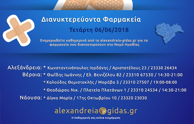 ΤΟΠΙΚΑ 6 Ιουνίου, 2018 posted by admin Share Εφημερεύοντα – διανυκτερεύοντα φαρμακεία Ημαθίας Τετάρτη 6 Ιουνίου Αλεξάνδρεια: Αφήστε μια απάντηση Ακύρωση απάντησηςΗ ηλ. διεύθυνση σας δεν δημοσιεύεται. Τα υποχρεωτικά πεδία σημειώνονται με *Σχόλιο * Όνομα Email Ιστότοπος Αποθήκευσε το όνομά μου, email, και τον ιστότοπο μου σε αυτόν τον πλοηγό για την επόμενη φορά που θα σχολιάσω.