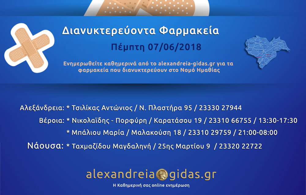 ΤΟΠΙΚΑ 7 Ιουνίου, 2018 posted by admin Share Εφημερεύοντα – διανυκτερεύοντα φαρμακεία Ημαθίας Πέμπτη 7 Ιουνίου Αλεξάνδρεια: Αφήστε μια απάντηση Ακύρωση απάντησηςΗ ηλ. διεύθυνση σας δεν δημοσιεύεται. Τα υποχρεωτικά πεδία σημειώνονται με *Σχόλιο * Όνομα Email Ιστότοπος Αποθήκευσε το όνομά μου, email, και τον ιστότοπο μου σε αυτόν τον πλοηγό για την επόμενη φορά που θα σχολιάσω.