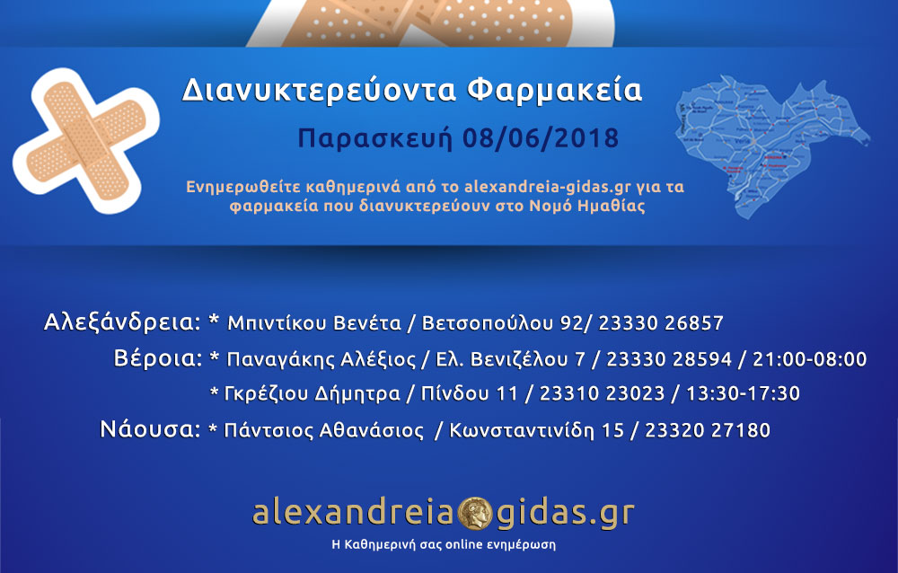 ΤΟΠΙΚΑ 8 Ιουνίου, 2018 posted by admin Share Εφημερεύοντα – διανυκτερεύοντα φαρμακεία Ημαθίας Παρασκευή 8 Ιουνίου Αλεξάνδρεια: Αφήστε μια απάντηση Ακύρωση απάντησηςΗ ηλ. διεύθυνση σας δεν δημοσιεύεται. Τα υποχρεωτικά πεδία σημειώνονται με *Σχόλιο * Όνομα Email Ιστότοπος Αποθήκευσε το όνομά μου, email, και τον ιστότοπο μου σε αυτόν τον πλοηγό για την επόμενη φορά που θα σχολιάσω.