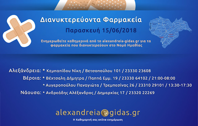 Εφημερεύοντα – διανυκτερεύοντα φαρμακεία Ημαθίας Παρασκευή 15 Ιουνίου