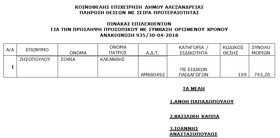 Η Κοινωφελής Επιχείρηση του Δήμου Αλεξάνδρειας ανακοινώνει τους Προσωρινούς πίνακες για την πρόσληψη προσωπικού με σύμβαση εργασίας Ιδιωτικού δικαίου – Ορισμένου χρόνου για τη στελέχωση της Δομής ΚΔΑΠ-ΜΕΑ στην Αλεξάνδρεια ενός ατόμου ειδικότητας ΠΕ Ειδικών Παιδαγωγών με κωδικό θέσης 109, σύμφωνα με την αριθμ. 935/30-04-2018 Ανακοίνωση της ΚΕΔΑ