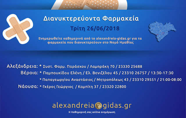 ΤΟΠΙΚΑ 26 Ιουνίου, 2018 posted by admin Share Εφημερεύοντα – διανυκτερεύοντα φαρμακεία Ημαθίας Τρίτη 26 Ιουνίου Αλεξάνδρεια: Αφήστε μια απάντηση Ακύρωση απάντησηςΗ ηλ. διεύθυνση σας δεν δημοσιεύεται. Τα υποχρεωτικά πεδία σημειώνονται με *Σχόλιο * Όνομα Email Ιστότοπος Αποθήκευσε το όνομά μου, email, και τον ιστότοπο μου σε αυτόν τον πλοηγό για την επόμενη φορά που θα σχολιάσω.