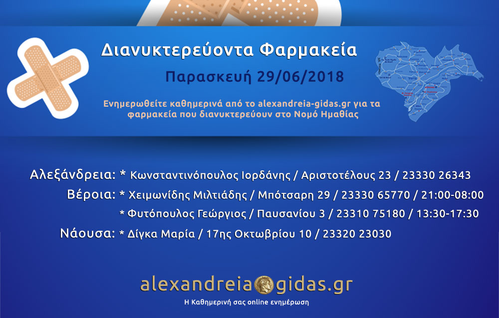 ΤΟΠΙΚΑ 29 Ιουνίου, 2018 posted by admin Share Εφημερεύοντα – διανυκτερεύοντα φαρμακεία Ημαθίας Παρασκευή 29 Ιουνίου Αλεξάνδρεια: Αφήστε μια απάντηση Ακύρωση απάντησηςΗ ηλ. διεύθυνση σας δεν δημοσιεύεται. Τα υποχρεωτικά πεδία σημειώνονται με *Σχόλιο * Όνομα Email Ιστότοπος Αποθήκευσε το όνομά μου, email, και τον ιστότοπο μου σε αυτόν τον πλοηγό για την επόμενη φορά που θα σχολιάσω.