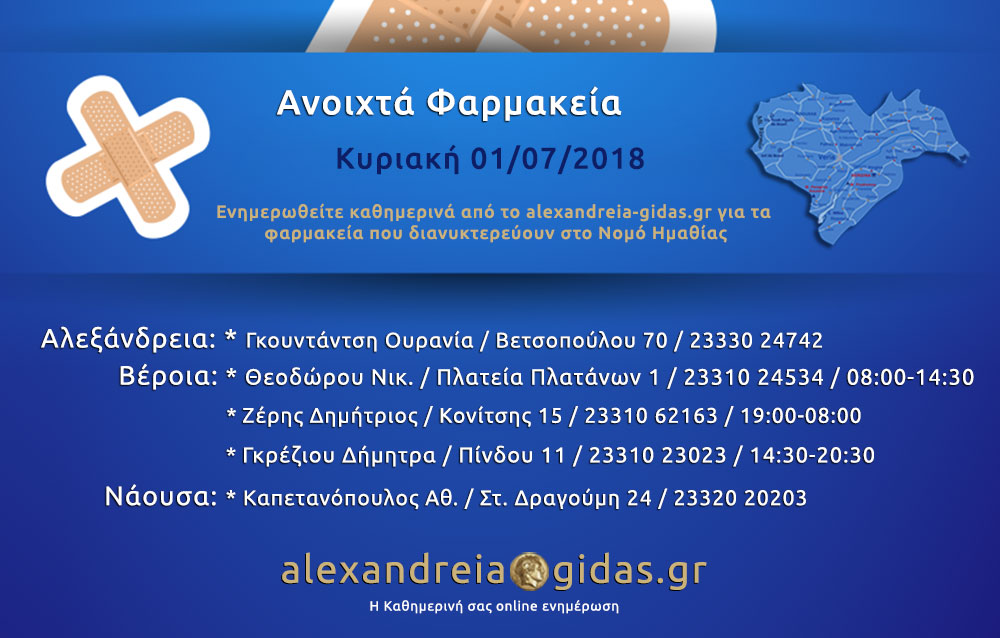ΤΟΠΙΚΑ 1 Ιουλίου, 2018 posted by admin Share Ανοιχτά φαρμακεία Ημαθίας Κυριακή 1 Ιουλίου Αλεξάνδρεια: Αφήστε μια απάντηση Ακύρωση απάντησηςΗ ηλ. διεύθυνση σας δεν δημοσιεύεται. Τα υποχρεωτικά πεδία σημειώνονται με *Σχόλιο * Όνομα Email Ιστότοπος Αποθήκευσε το όνομά μου, email, και τον ιστότοπο μου σε αυτόν τον πλοηγό για την επόμενη φορά που θα σχολιάσω.