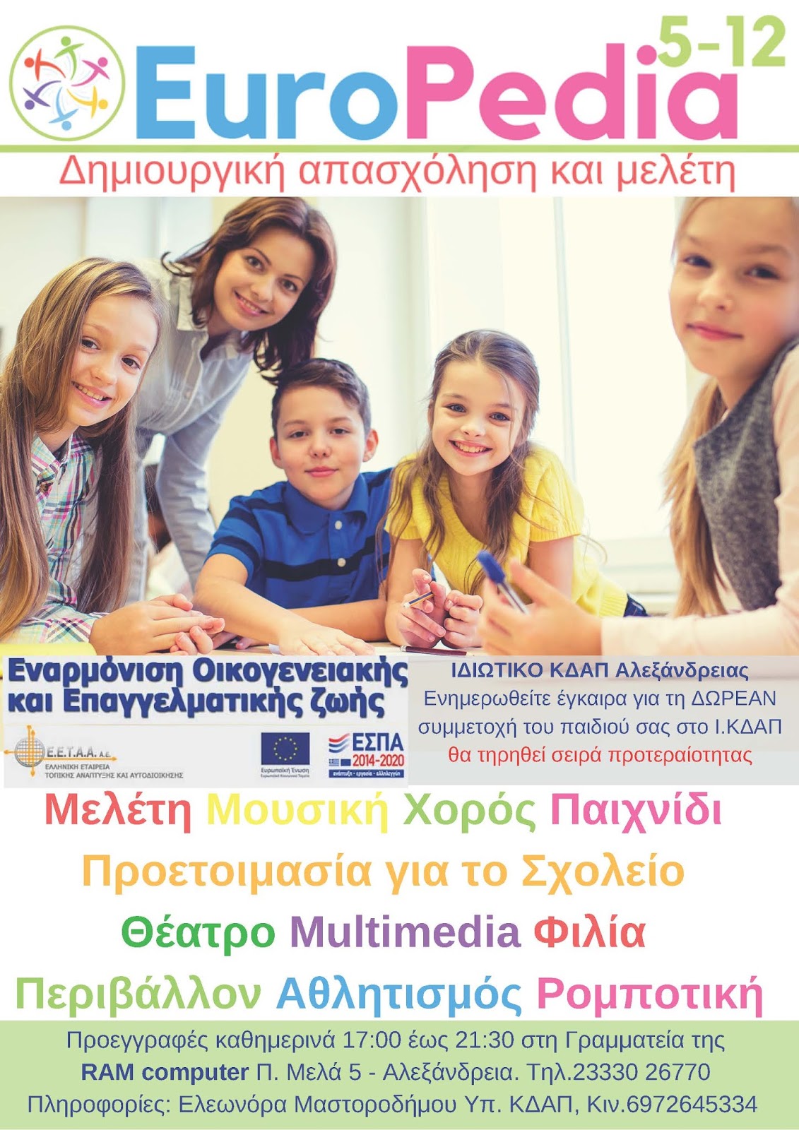 – Εντελώς Δωρεάν για όλο το χρόνο θα είναι τα προγράμματα μελέτης και δημιουργικής απασχόλησης στο νέο Ιδιωτικό ΚΔΑΠ Europedia στην πόλη της Αλεξάνδρειας.