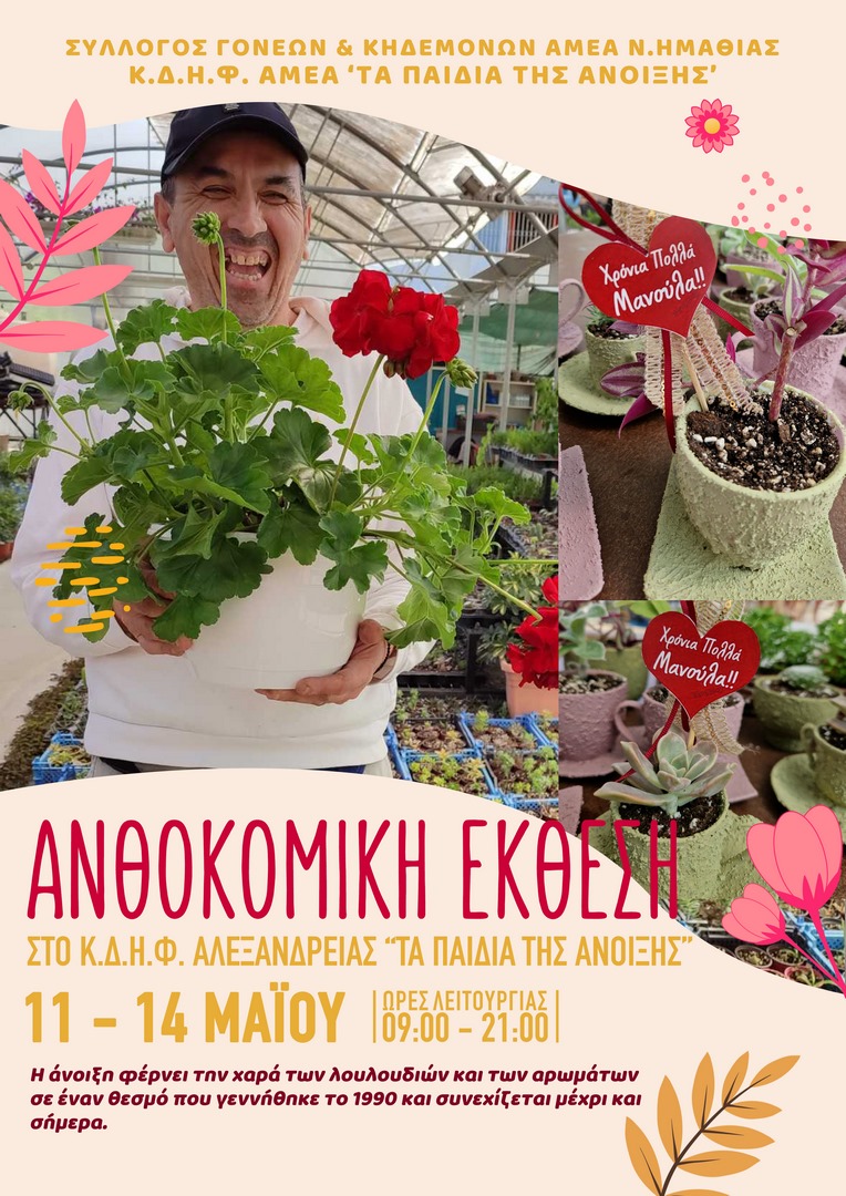 Από τις 11 έως και τις 14 Μαΐου 2023 το Κ.Δ.Η.Φ. ΑμεΑ «Τα Παιδιά της Άνοιξης» στην Αλεξάνδρεια θα στολιστεί με άνθη και φυτά από τις 09:00 το πρωί ως τις 21:00 το βράδυ.