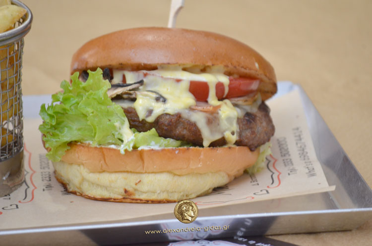 Ζουμερό μοσχαρίσιο μπιφτέκι, brioche (ψωμάκι), κασέρι, μπέικον, μανιτάρι, μαρούλι, ντομάτα, τυρί κρέμα, sauce μουστάρδας.