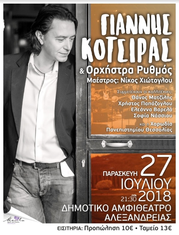 Ξεκίνησε η προπώληση εισιτηρίων για τη συναυλία του «Γιάννη Κότσιρα» με τη χορωδία του Πανεπιστημίου Θεσσαλίας, που θα πραγματοποιηθεί στο Δημοτικό Αμφιθέατρο Αλεξάνδρειας την Παρασκευή 27 Ιουλίου και ώρα 21.30΄.