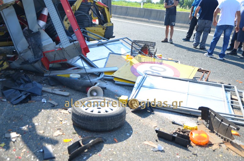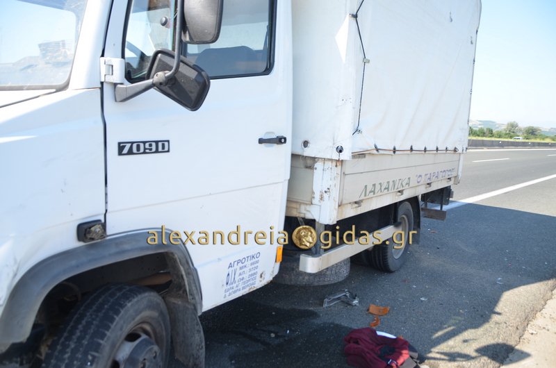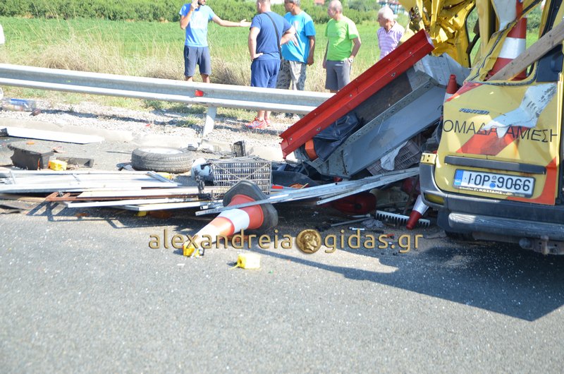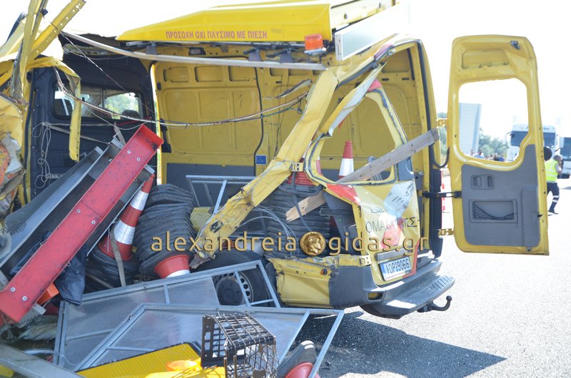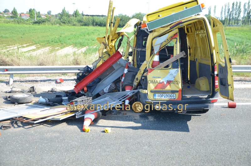 Από την σύγκρουση τραυματίστηκε ο οδηγός του Ι.Χ. αυτοκινήτου που προφανώς σταμάτησε να αλλάξει λάστιχο και μεταφέρθηκε με ασθενοφόρο στο Νοσοκομείο της Βέροιας. Ο οδηγός του από το φορτηγάκι και η ομάδα της Εγνατίας Οδού δεν τραυματίστηκαν.
