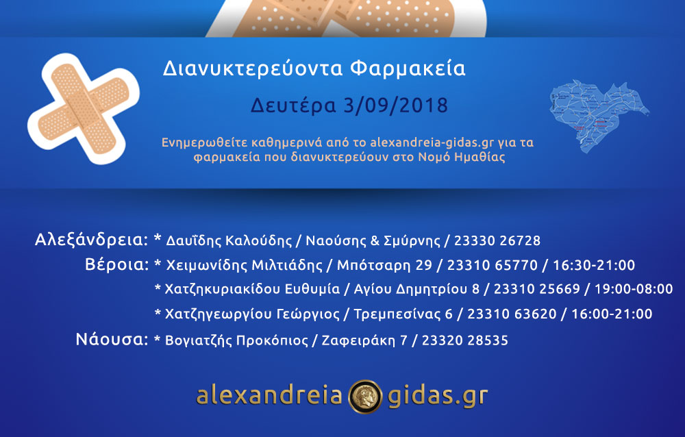 ΤΟΠΙΚΑ 3 Σεπτεμβρίου, 2018 posted by admin Share Εφημερεύοντα – διανυκτερεύοντα φαρμακεία Ημαθίας Δευτέρα 3 Σεπτεμβρίου Αλεξάνδρεια: Αφήστε μια απάντηση Ακύρωση απάντησηςΗ ηλ. διεύθυνση σας δεν δημοσιεύεται. Τα υποχρεωτικά πεδία σημειώνονται με *Σχόλιο * Όνομα Email Ιστότοπος Αποθήκευσε το όνομά μου, email, και τον ιστότοπο μου σε αυτόν τον πλοηγό για την επόμενη φορά που θα σχολιάσω.