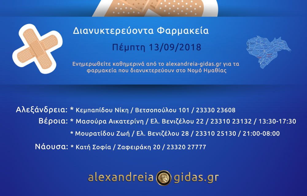 ΤΟΠΙΚΑ 13 Σεπτεμβρίου, 2018 posted by admin Share Εφημερεύοντα – διανυκτερεύοντα φαρμακεία Ημαθίας Πέμπτη 13 Σεπτεμβρίου Αλεξάνδρεια: Αφήστε μια απάντηση Ακύρωση απάντησηςΗ ηλ. διεύθυνση σας δεν δημοσιεύεται. Τα υποχρεωτικά πεδία σημειώνονται με *Σχόλιο * Όνομα Email Ιστότοπος Αποθήκευσε το όνομά μου, email, και τον ιστότοπο μου σε αυτόν τον πλοηγό για την επόμενη φορά που θα σχολιάσω.