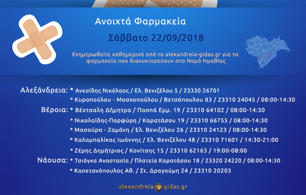 ΤΟΠΙΚΑ 21 Σεπτεμβρίου, 2018 posted by admin Share Ανοιχτά φαρμακεία Ημαθίας Σάββατο 22 Σεπτεμβρίου Αλεξάνδρεια: Αφήστε μια απάντηση Ακύρωση απάντησηςΗ ηλ. διεύθυνση σας δεν δημοσιεύεται. Τα υποχρεωτικά πεδία σημειώνονται με *Σχόλιο * Όνομα Email Ιστότοπος Αποθήκευσε το όνομά μου, email, και τον ιστότοπο μου σε αυτόν τον πλοηγό για την επόμενη φορά που θα σχολιάσω.