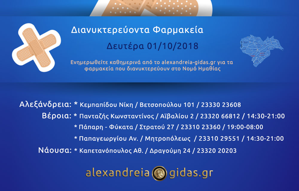 ΤΟΠΙΚΑ 1 Οκτωβρίου, 2018 posted by admin Share Εφημερεύοντα – διανυκτερεύοντα φαρμακεία Ημαθίας Δευτέρα 1 Οκτωβρίου Αλεξάνδρεια: Αφήστε μια απάντηση Ακύρωση απάντησηςΗ ηλ. διεύθυνση σας δεν δημοσιεύεται. Τα υποχρεωτικά πεδία σημειώνονται με *Σχόλιο * Όνομα Email Ιστότοπος Αποθήκευσε το όνομά μου, email, και τον ιστότοπο μου σε αυτόν τον πλοηγό για την επόμενη φορά που θα σχολιάσω.