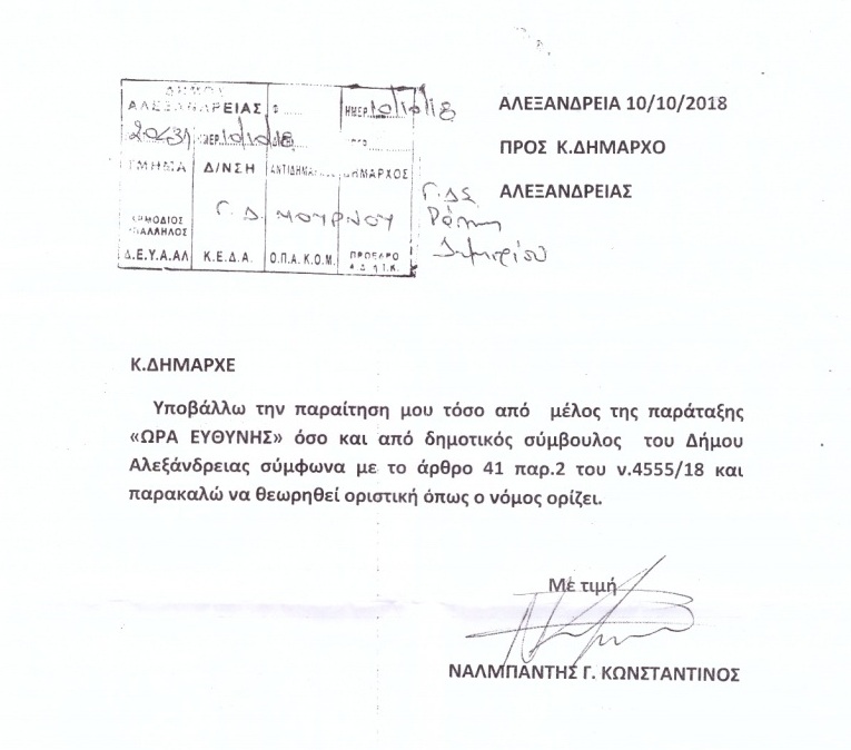 Η παραίτηση αυτή ουσιαστικά επιβεβαιώνει και την υποψηφιότητα του κυρίου Ναλμπάντη ως υποψηφίου δημάρχου Αλεξάνδρειας στις δημοτικές εκλογές του 2019.