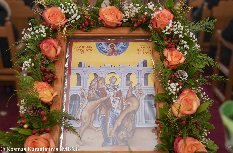 Σήμερα μάλιστα ἔχετε τήν ἰδιαίτερη εὐλογία νά προσκυνήσετε καί νά ἀσπασθεῖτε τή σεπτή καί χαριτόβρυτο κάρα τοῦ ἁγίου ἱερομάρτυρος Ἰγνατίου τοῦ Θεοφόρου, ἡ ὁποία ἀποτελεῖ πολύτιμο πνευματικό θησαυρό τῆς Ἱερᾶς μας Μητροπόλεως, καί τήν ὁποία μεταφέραμε ἀπόψε στήν ἐνορία σας μέ τήν εὐκαιρία τῆς σημερινῆς ἑορτῆς τῆς μνήμης του.