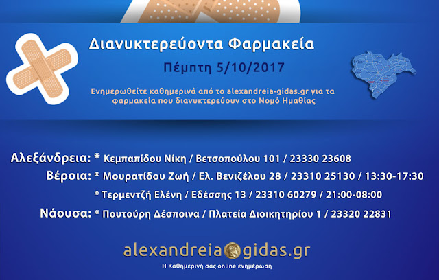 ΤΟΠΙΚΑ 5 Οκτωβρίου, 2017 posted by admin Share Εφημερεύοντα – διανυκτερεύοντα φαρμακεία Ημαθίας Πέμπτη 5 Οκτωβρίου Αλεξάνδρεια: Αφήστε μια απάντηση Ακύρωση απάντησηςΗ ηλ. διεύθυνση σας δεν δημοσιεύεται. Τα υποχρεωτικά πεδία σημειώνονται με *Σχόλιο * Όνομα Email Ιστότοπος Αποθήκευσε το όνομά μου, email, και τον ιστότοπο μου σε αυτόν τον πλοηγό για την επόμενη φορά που θα σχολιάσω.