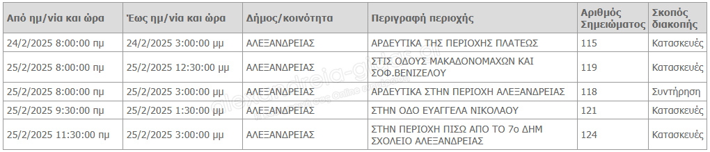 Που θα γίνουν διακοπές ρεύματος Δευτέρα και Τρίτη στον δήμο Αλεξάνδρειας