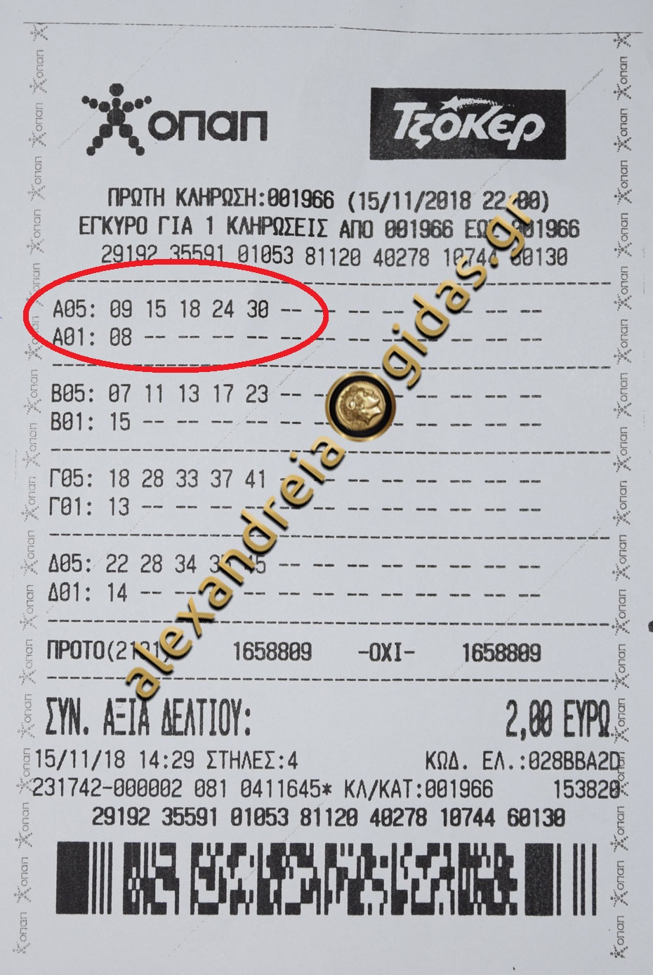 Θυμίζουμε πως το δελτίο παίχτηκε στο πρακτορείο ΟΠΑΠ της Δήμητρας Απατσίδου στη Γρ. Λαμπράκη 67 στην Αλεξάνδρεια στην κλήρωση της Πέμπτης 15 Νοεμβρίου και στοίχε μόλις 2 ευρώ.