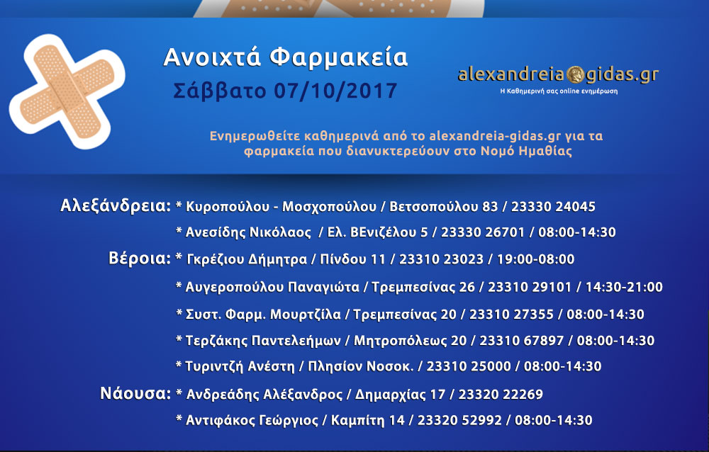 ΤΟΠΙΚΑ 7 Οκτωβρίου, 2017 posted by admin Share Ανοιχτά φαρμακεία Ημαθίας Σάββατο 7 Οκτωβρίου Αλεξάνδρεια: Αφήστε μια απάντηση Ακύρωση απάντησηςΗ ηλ. διεύθυνση σας δεν δημοσιεύεται. Τα υποχρεωτικά πεδία σημειώνονται με *Σχόλιο * Όνομα Email Ιστότοπος Αποθήκευσε το όνομά μου, email, και τον ιστότοπο μου σε αυτόν τον πλοηγό για την επόμενη φορά που θα σχολιάσω.