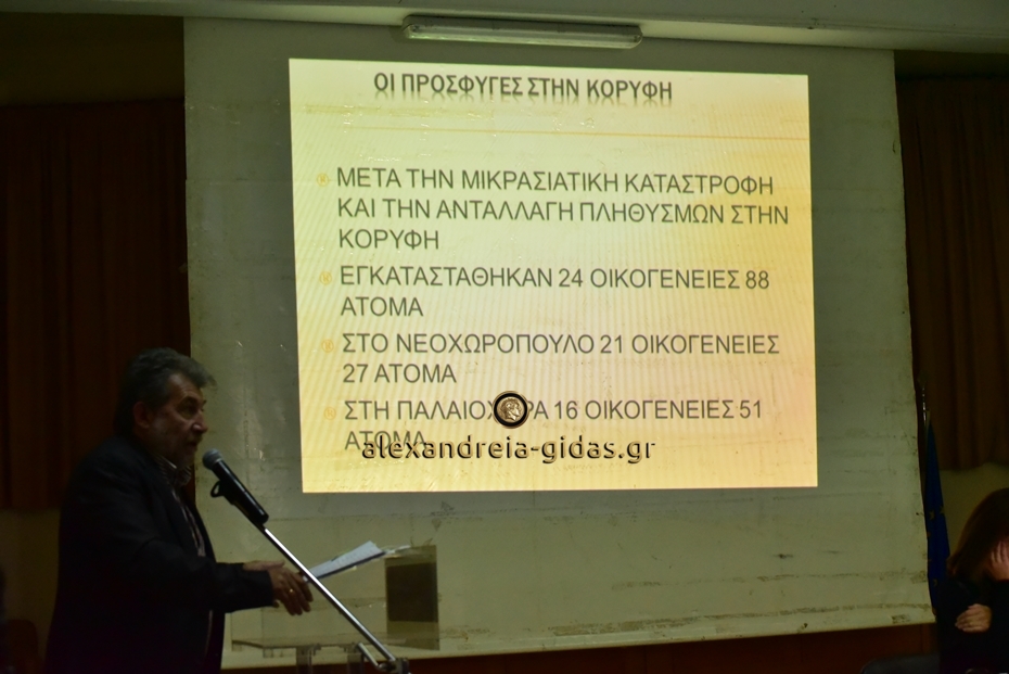 Την εκδήλωση προλόγισε ο πρόεδρος της Τοπικής Κοινότητας Κορυφής Διονύσης Γιοβανόπουλος ενώ την ιστορική αναδρομή έκανε ο Διευθυντής του 7ου Δημοτικού Σχολείου Αλεξάνδρειας και ιστορικός Γρηγόρης Γιοβανόπουλος.