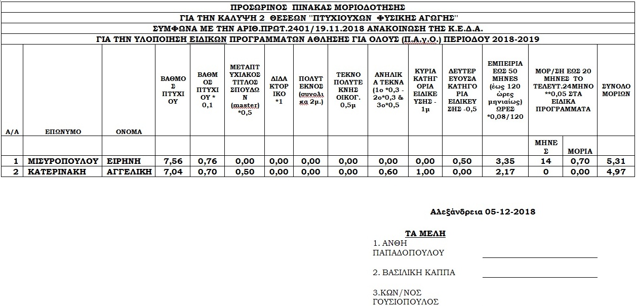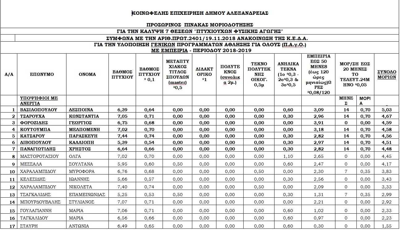 Ανακοινώθηκαν σήμερα από την Κοινωφελή Επιχείρηση του Δήμου Αλεξάνδρειας οι προσωρινοί πίνακες Μοριοδότησης για την Πρόσληψη Πτυχιούχων Φυσ. Αγωγής από την Κοινωφελή Επιχείρηση του Δήμου Αλεξάνδρειας για την υλοποίηση των Προγραμμάτων Άθλησης για όλους (Π.Α.γ.Ο.) περιόδου 2018-19.