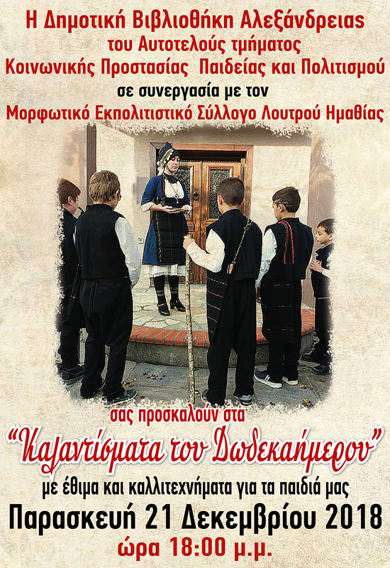 Η Δημοτική Βιβλιοθήκη Αλεξάνδρειας του Αυτοτελούς Τμήματος Κοινωνικής Προστασίας, Παιδείας και Πολιτισμού σε συνεργασία με τον Μορφωτικό Εκπολιτιστικό Σύλλογο Λουτρού Ημαθίας σας προσκαλούν στα “Καλαντίσματα του Δωδεκαήμερου” με έθιμα και καλλιτεχνήματα για τα παιδιά μας,την Παρασκευή 21 Δεκεμβρίου 2018 και ώρα 6:00 μ.μ. στο χώρο της Δημοτικής Βιβλιοθήκης.