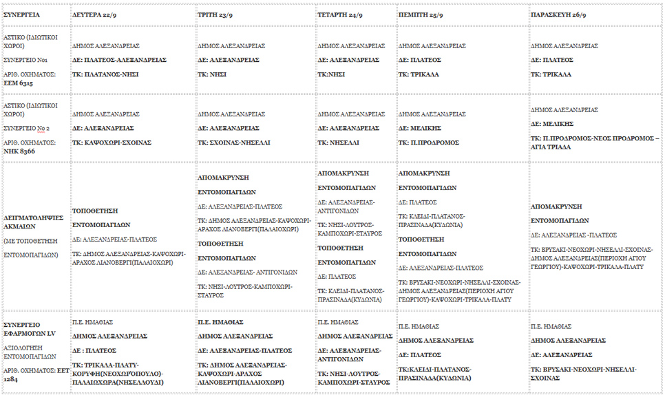 Ανακοινώνεται από τον δήμο Αλεξάνδρειας το πρόγραμμα Αστικής Επίγειας Καταπολέμησης Κουνουπιών για την εβδομάδα από σήμερα Δευτέρα 22, έως και την Παρασκευή, 26 Σεπτεμβρίου 2025.